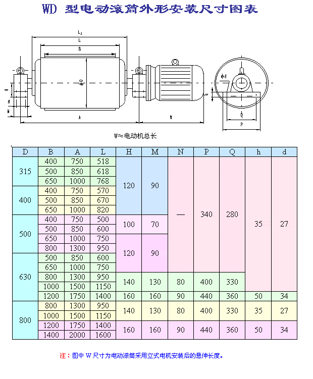(1).因目前外裝式電動(dòng)滾筒尚未制定相關(guān)行業(yè)標(biāo)準(zhǔn),本廠將該型號(hào)電動(dòng)滾筒首位代號(hào)用W(“外裝”的首位漢語拼音)表示。外裝式電動(dòng)滾筒外置電機(jī)可分為立式電機(jī)和臥式電機(jī),用戶訂購時(shí)請(qǐng)加以說明;